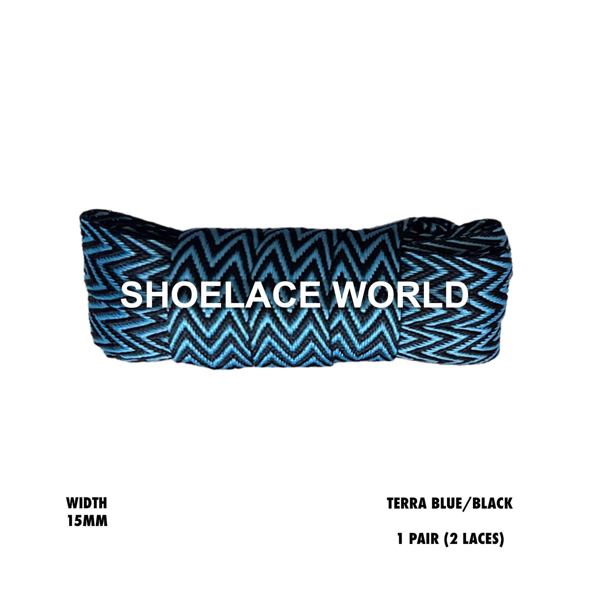 Terra Blue/Black W-Threaded Pattern Flat Shoelaces 15mm Colorful Pattern Laces Ships Out From The USA Next Day