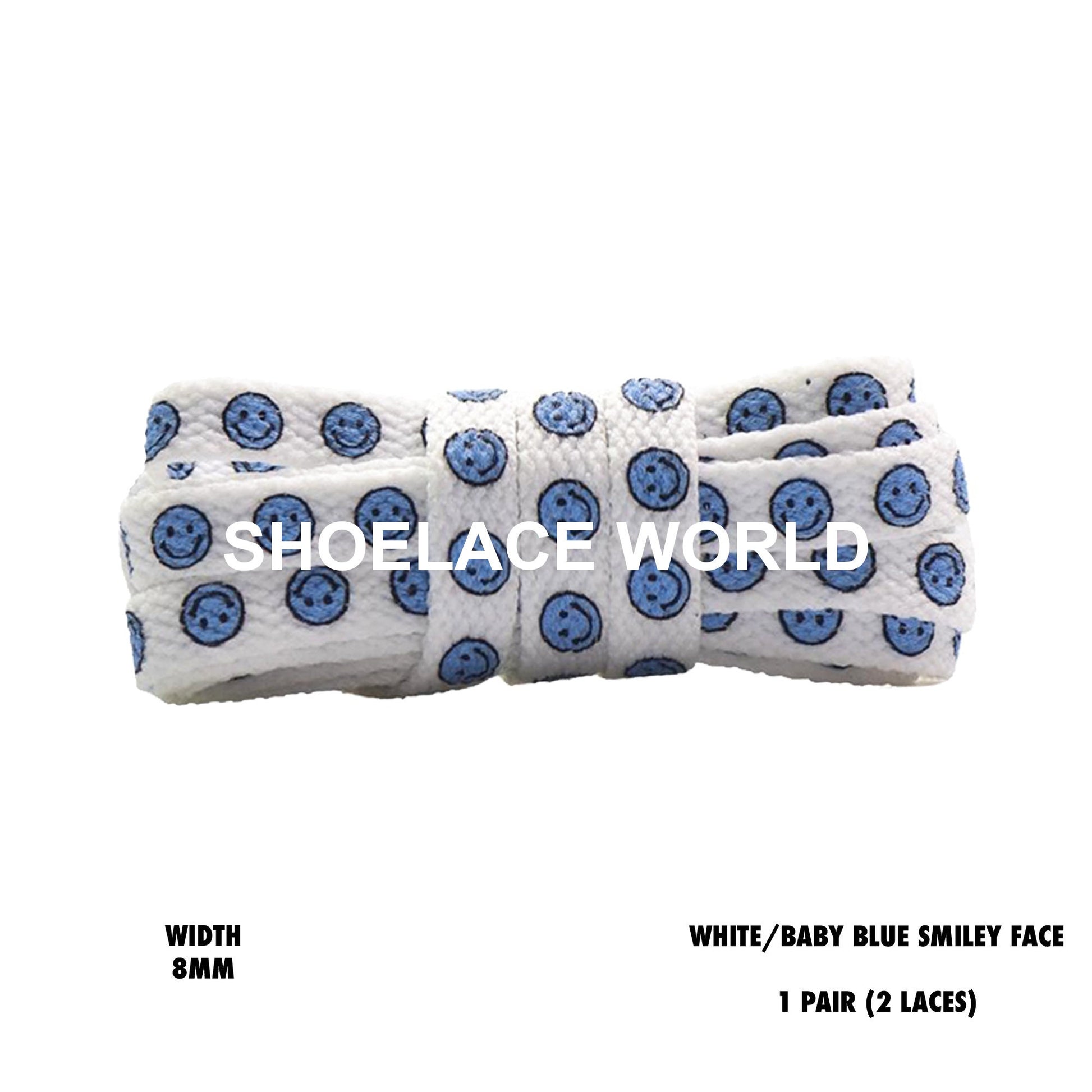 White / Baby Blue Smiley Face Print Flat Shoelaces 8mm Colorful Printed Laces Ships Out From The USA Next Day